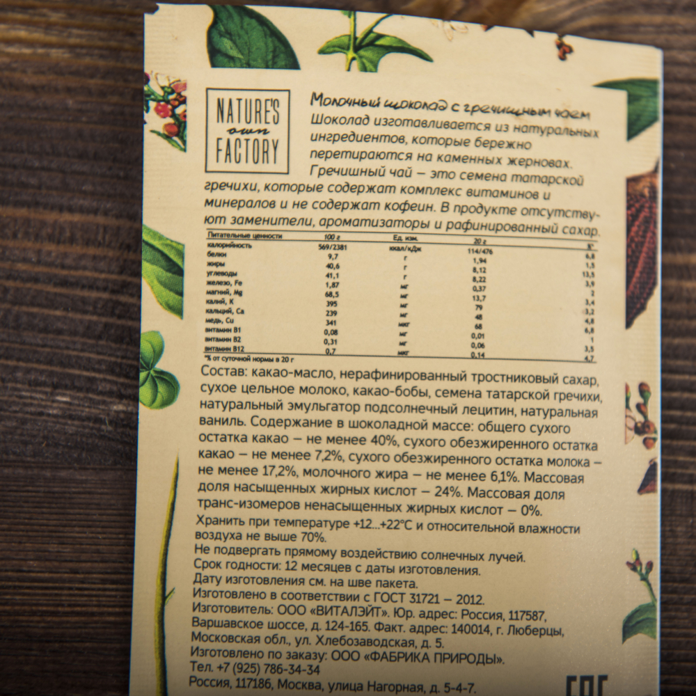 Состав:какао-бобы, какао-масло, сухое цельное молоко, нерафинированный тростниковый сахар, гречишный чай, натуральный эмульгатор подсолнечный лицитин.