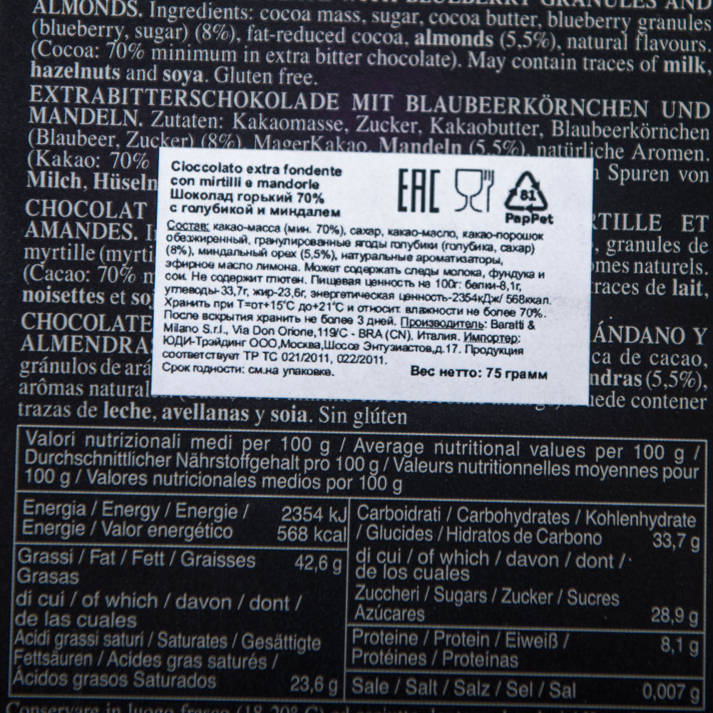 Cioccolato extra fondente 70% con mirtillo e mandorla - горький шоколад с сочной голубикой и сладким миндалем.